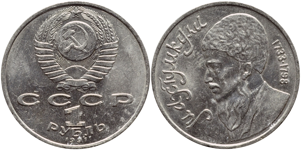 СССР 1 РУБЛЬ 1991 МАХТУМКУЛИ ФРАГИ (1733-1798) KM 283 медно-никель 4394-516