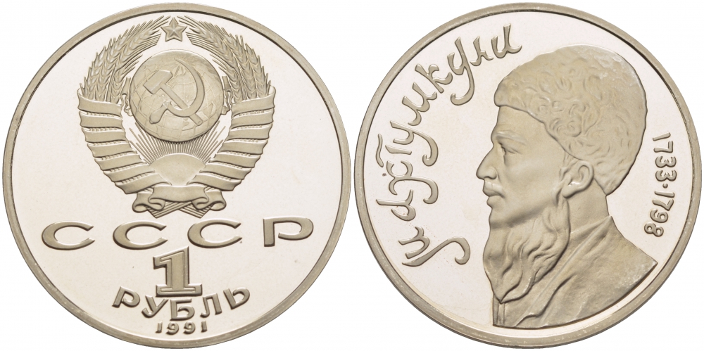 СССР 1 РУБЛЬ 1991 МАХТУМКУЛИ ФРАГИ (1733-1798) KM 283 медно-никель PROOF 4127-1121
