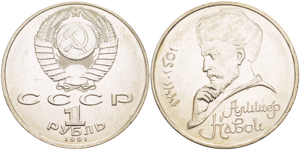 СССР 1 РУБЛЬ 1991 ММД, 550 ЛЕТ СО ДНЯ РОЖДЕНИЯ АЛИШЕРА НАВОИ (1441-1501), ПРОСВЕТ БУКВЫ Д В СЛОВЕ ОДИН НА ГУРТЕ, ИМЕЕТ ФОРМУ РАВНОБЕДРЕННОГО ТРЕУГОЛЬНИКА KM 260 медно-никель 4183-135