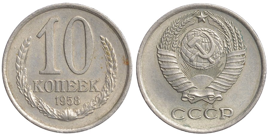СССР 10 копеек 1958 Пробный чекан, невыпущенная в обращение монета Федорин 124, KM A130 медно-никель 10-017-68