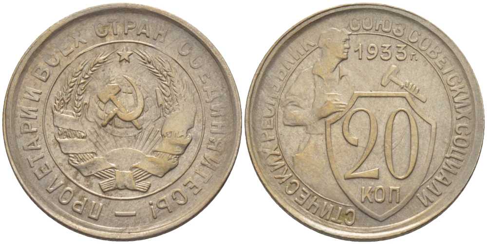 СССР 20 КОПЕЕК 1933 Федорин 29, у первого, правого, к земному шару колоса - две ости KM 97 медно-никель 119-1216