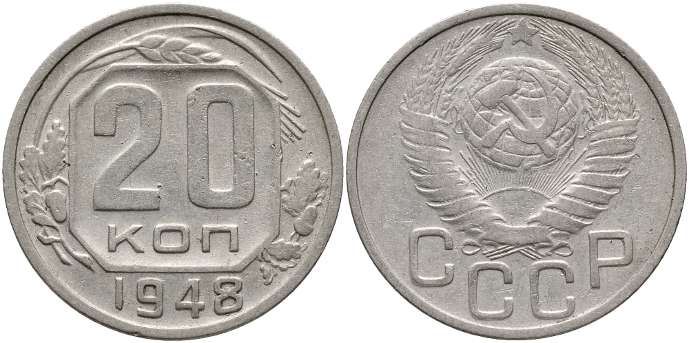 СССР 20 КОПЕЕК 1948 Федорин 76, БУКВА Р ПРИПОДНЯТА ОТНОСИТЕЛЬНО ТРЕТЬЕЙ БУКВЫ С, ЦИФРЫ ДАТЫ РАССТАВЛЕНЫ, 4 МАЛОГО РАЗМЕРА KM 118 медно-никель 418-114
