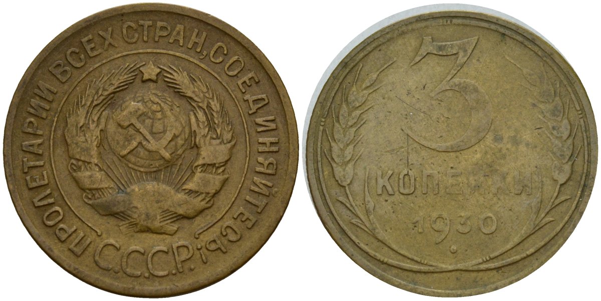 СССР 3 копейки 1930 KM 93, Федорин 20 алюминиевая бронза 4159-112