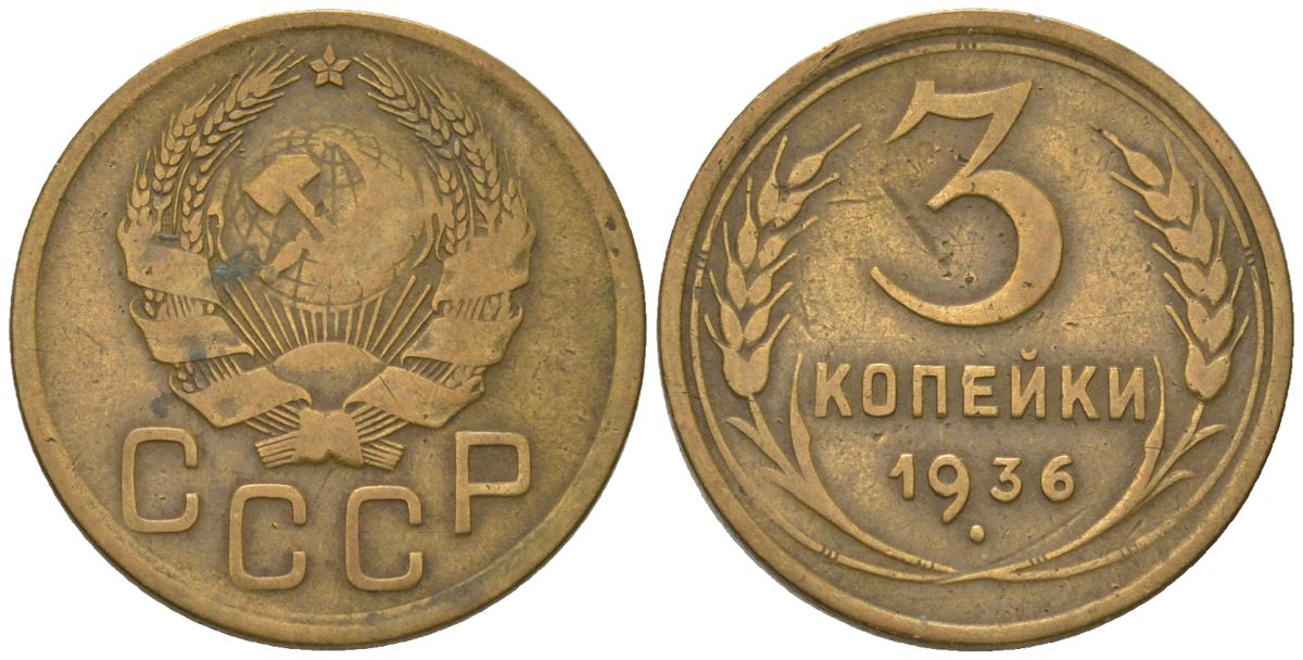 СССР 3 копейки 1936 KM 100 алюминиевая бронза 4564-1117