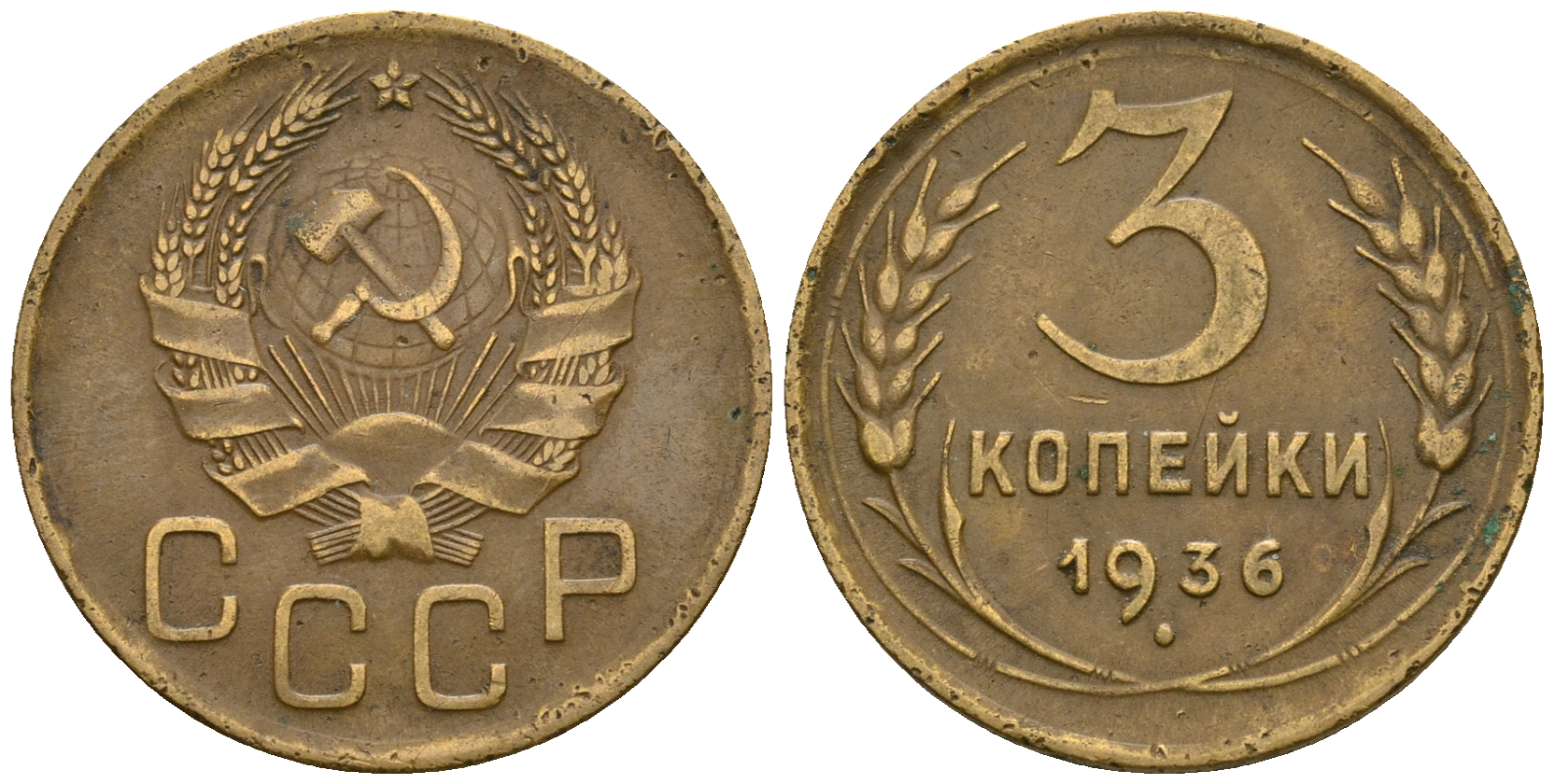 СССР 3 копейки 1936 KM 100, Федорин 42 алюминиевая бронза 4575-251