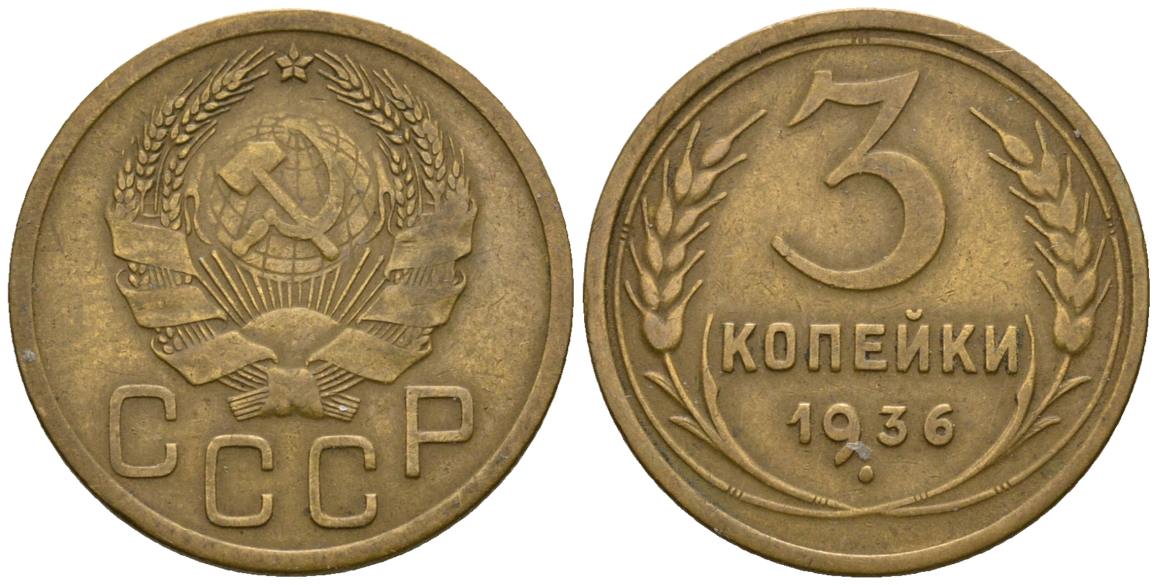 СССР 3 копейки 1936 KM 100, Федорин 42 алюминиевая бронза 4575-457