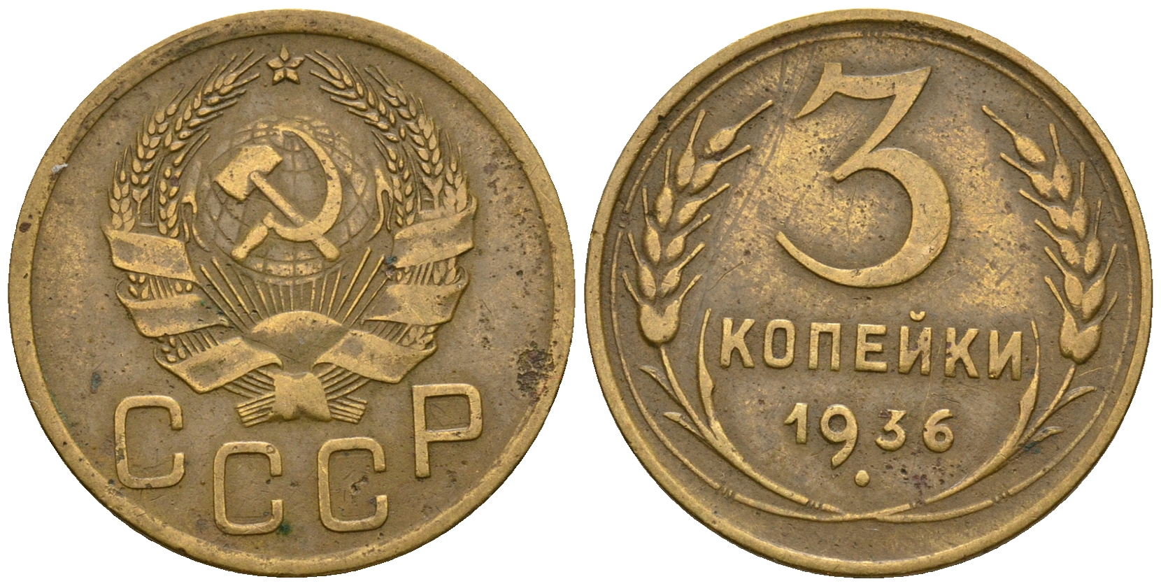 СССР 3 копейки 1936 KM 100, Федорин 42 алюминиевая бронза 4575-527