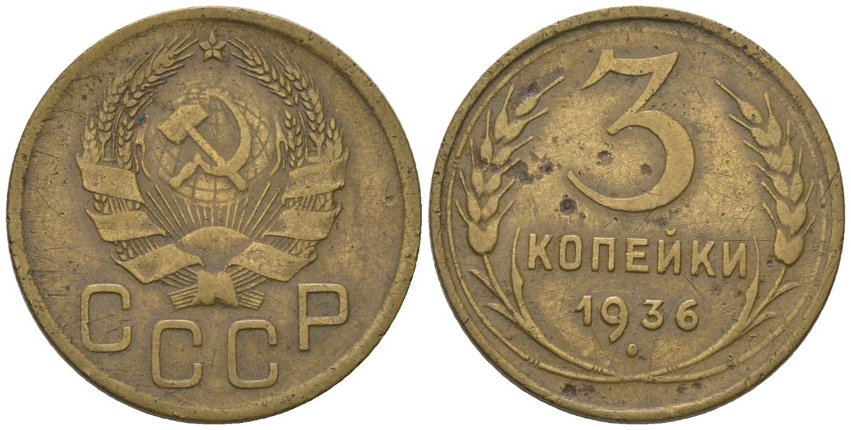 СССР 3 копейки 1936 KM 100, Schon 49 алюминиевая бронза 4606-1242