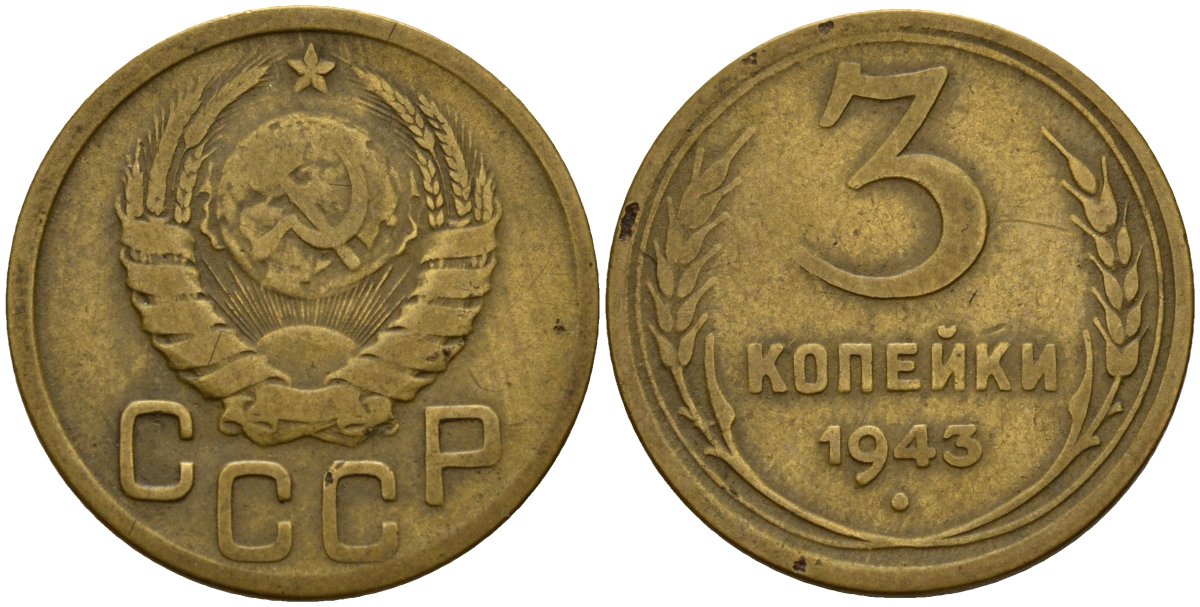 СССР 3 копейки 1943 Федорин 79 алюминиевая бронза 4159-142