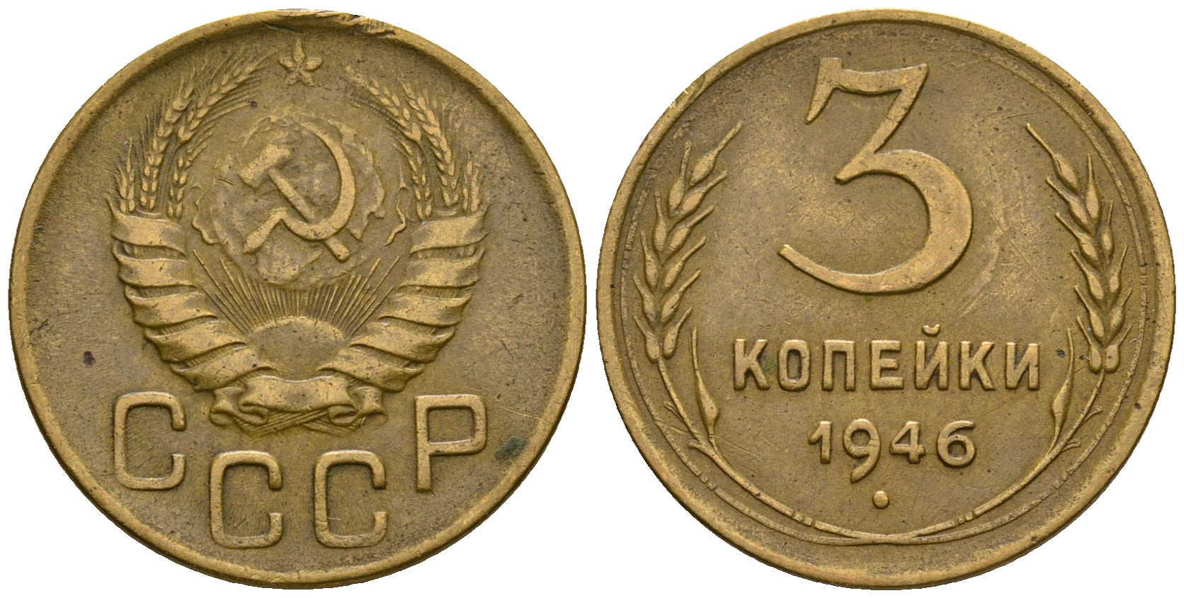 СССР 3 копейки 1946 KM 107, Федорин 85 алюминиевая бронза 4575-825