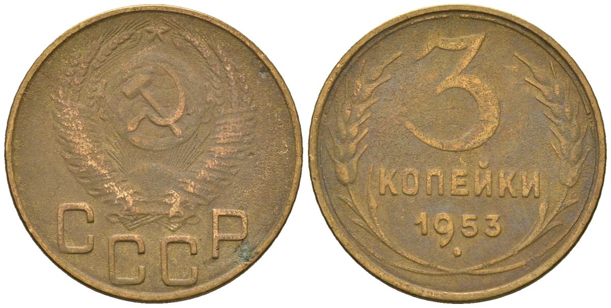 СССР 3 копейки 1953 KM 114, Schon 63 алюминиевая бронза 4586-422