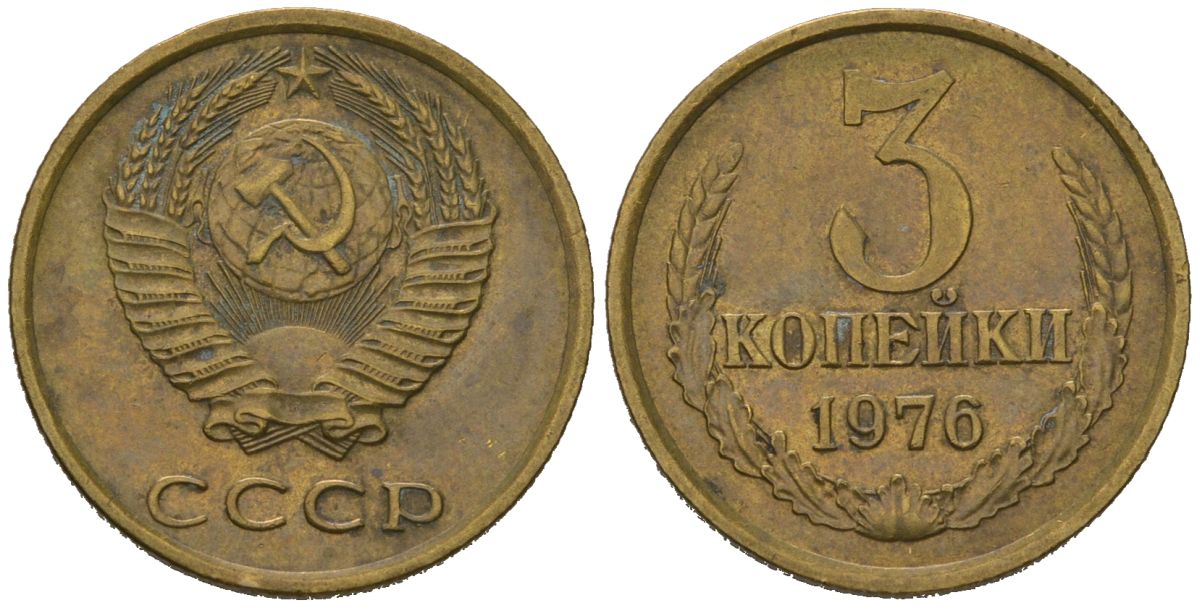СССР 3 копейки 1976 KM 128a, Schoon 77 латунь 4579-1021
