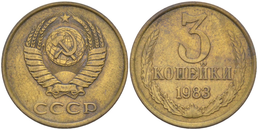 СССР 3 копейки 1983 три ости, герб уменьшен KM 128а, Федорин 195 латунь 4114-335
