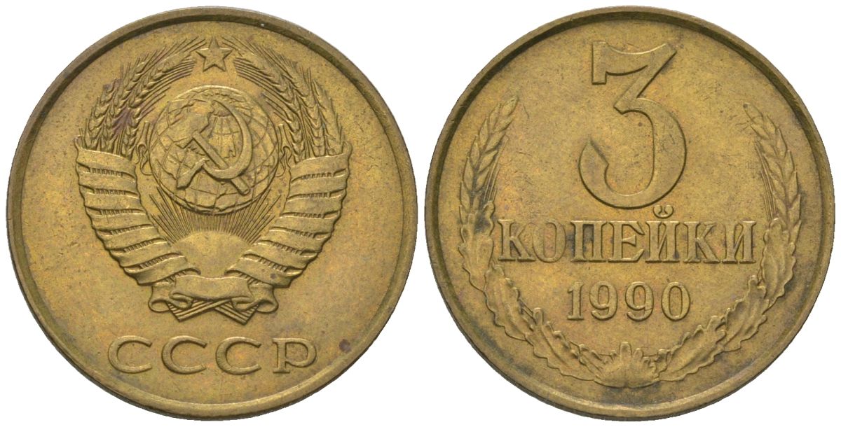 СССР 3 копейки 1990 KM?128a, Schon?77 латунь BUNC 4549-943