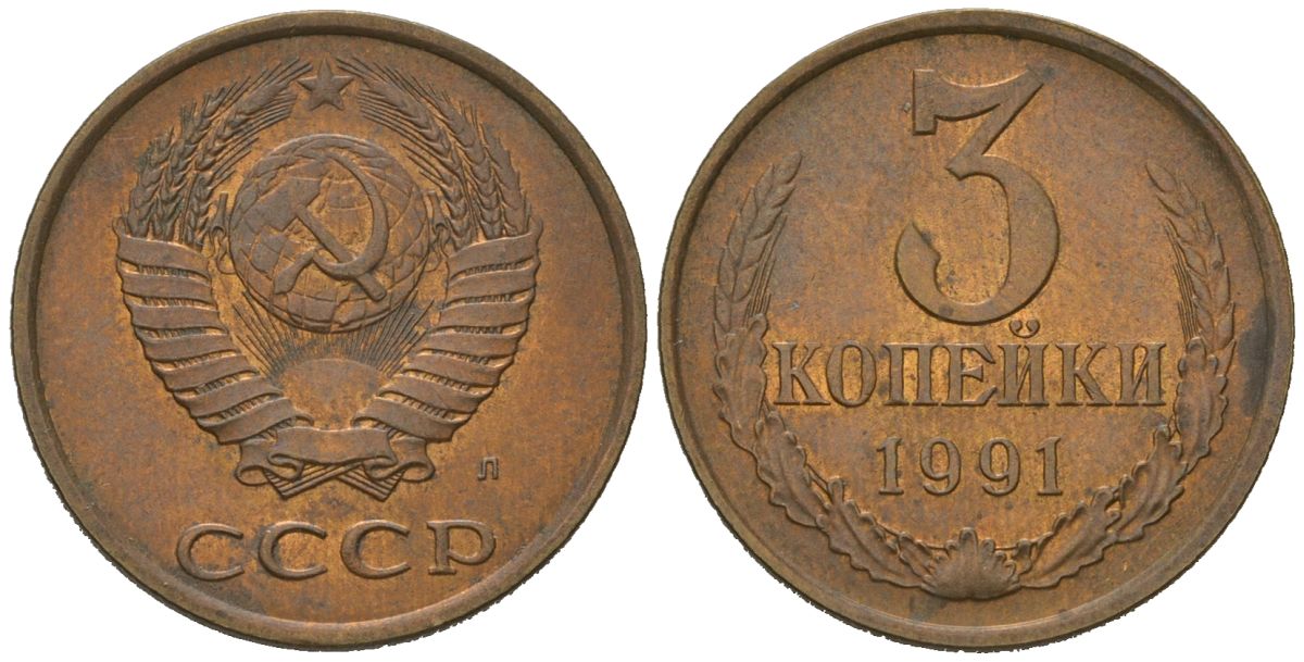 СССР 3 копейки 1991 Л KM 128a, Schoon 77 латунь aUNC 4579-1216