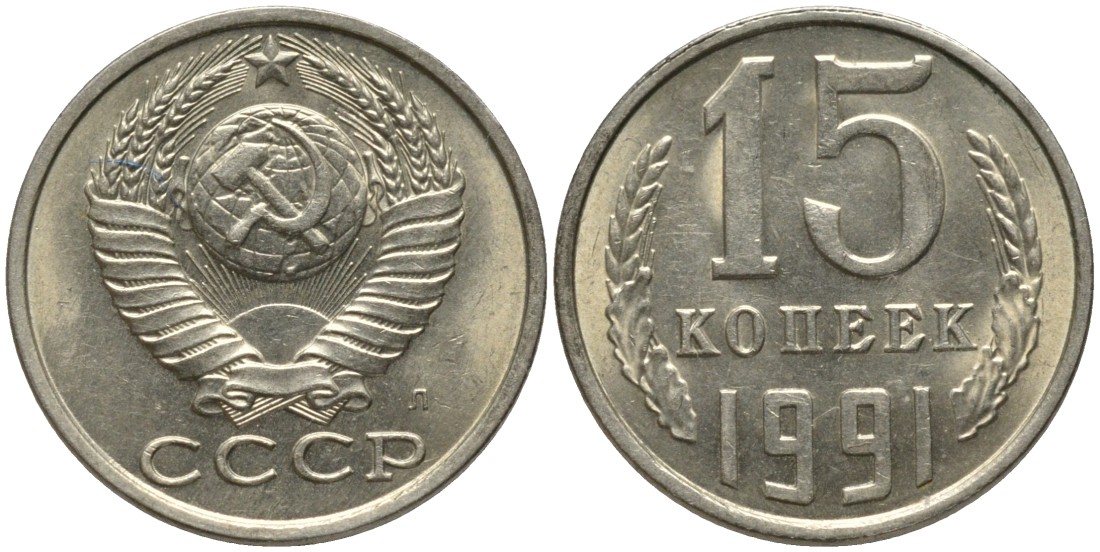 СССР 15 копеек 1991 ЛМД, буква "Л" KM 131, Федорин 168 медь никель цинк UNC 51-644