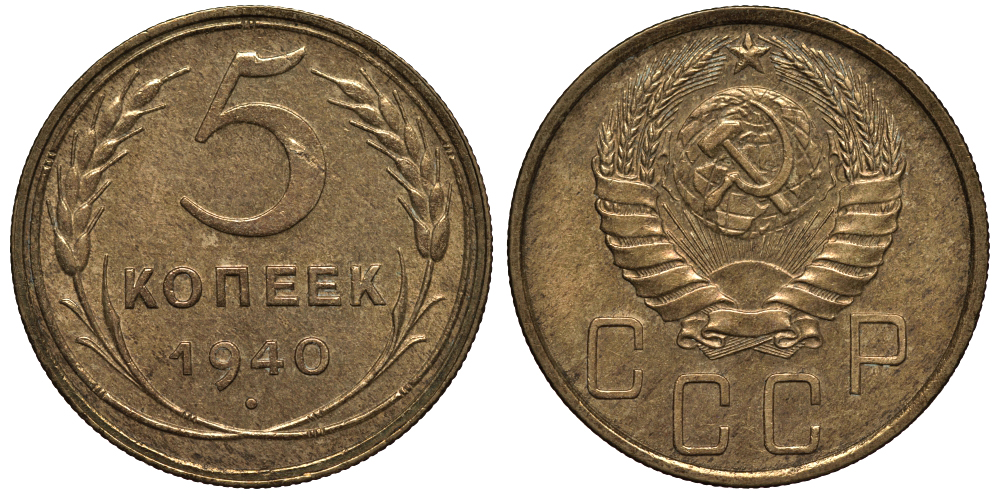 СССР 5 КОПЕЕК 1940 Федорин 44, ЛЕЗВИЕ СЕРПА УЗКОЕ, ЗВЕЗДА ГРАНЕНАЯ KM 108 алюминиевая бронза 1515-1831