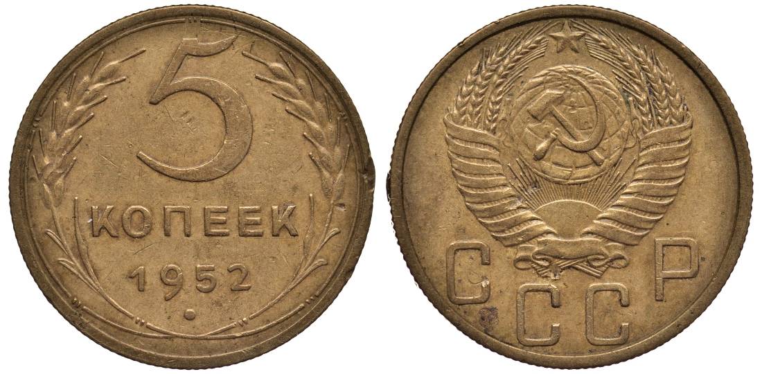 СССР 5 КОПЕЕК 1952 Федорин 82 алюминиевая бронза 219-714