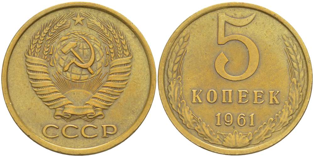 СССР 5 КОПЕЕК 1961 БУКВА Р ОТСТАВЛЕНА ВПРАВО, МЕЖДУ ЛИСТЬЯМИ ВЕНКА ЕСТЬ ЛИНИИ, СРЕЗЫ НЕ СОЕДИНЕНЫ KM 129а, Федорин 105 алюминиевая бронза 4531-211