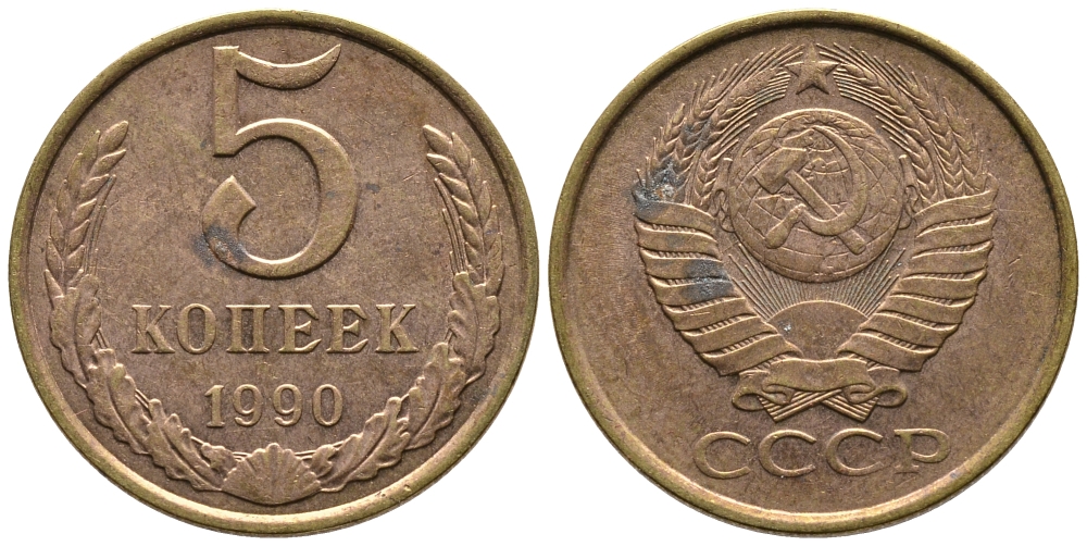 СССР 5 КОПЕЕК 1990 ЛМД, Федорин 143, ПОД ВТОРОЙ БУКВОЙ К ОДНА ЛИНИЯ KM 129a алюминиевая бронза 3999-436