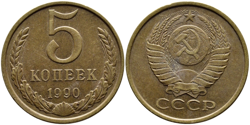 СССР 5 КОПЕЕК 1990 ЛМД, Федорин 143, ПОД ВТОРОЙ БУКВОЙ К ОДНА ЛИНИЯ KM 129a алюминиевая бронза 4391-1011