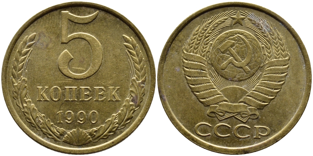 СССР 5 КОПЕЕК 1990 ММД, Федорин 144, ПОД ВТОРОЙ БУКВОЙ К ТРИ ЛИНИИ KM 129a алюминиевая бронза 4391-955
