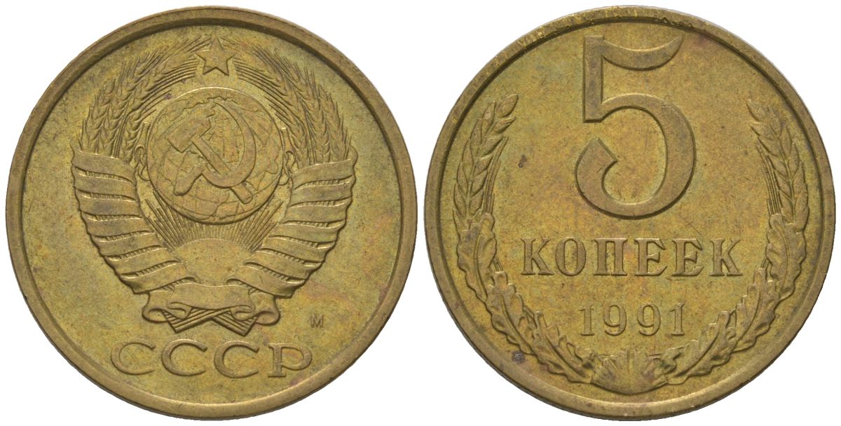СССР 5 копеек 1991 ММД Y 129a, Schon 78 латунь 210-541