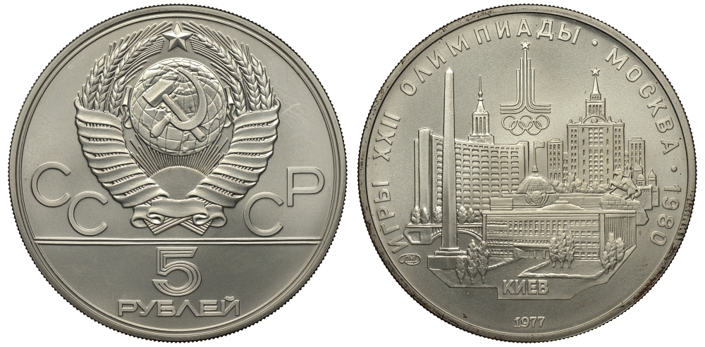 СССР 5 РУБЛЕЙ 1977 ЛМД, XXII ЛЕТНИЕ ОЛИМПИЙСКИЕ ИГРЫ 1980 ГОДА В МОСКВЕ, КИЕВ, ТИРАЖ 250000 ЭКЗ., ПРОБА 900, ВЕС 16,67 ГР. KM 145 серебро UNC 1078-10-61