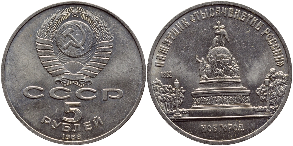 СССР 5 рублей 1988 Новгород, памятник "Тысячелетие России" KM 218 медь никель цинк 4552-1225