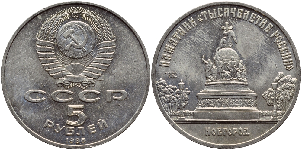СССР 5 рублей 1988 Новгород, памятник "Тысячелетие России" KM 218 медь никель цинк 4386-932