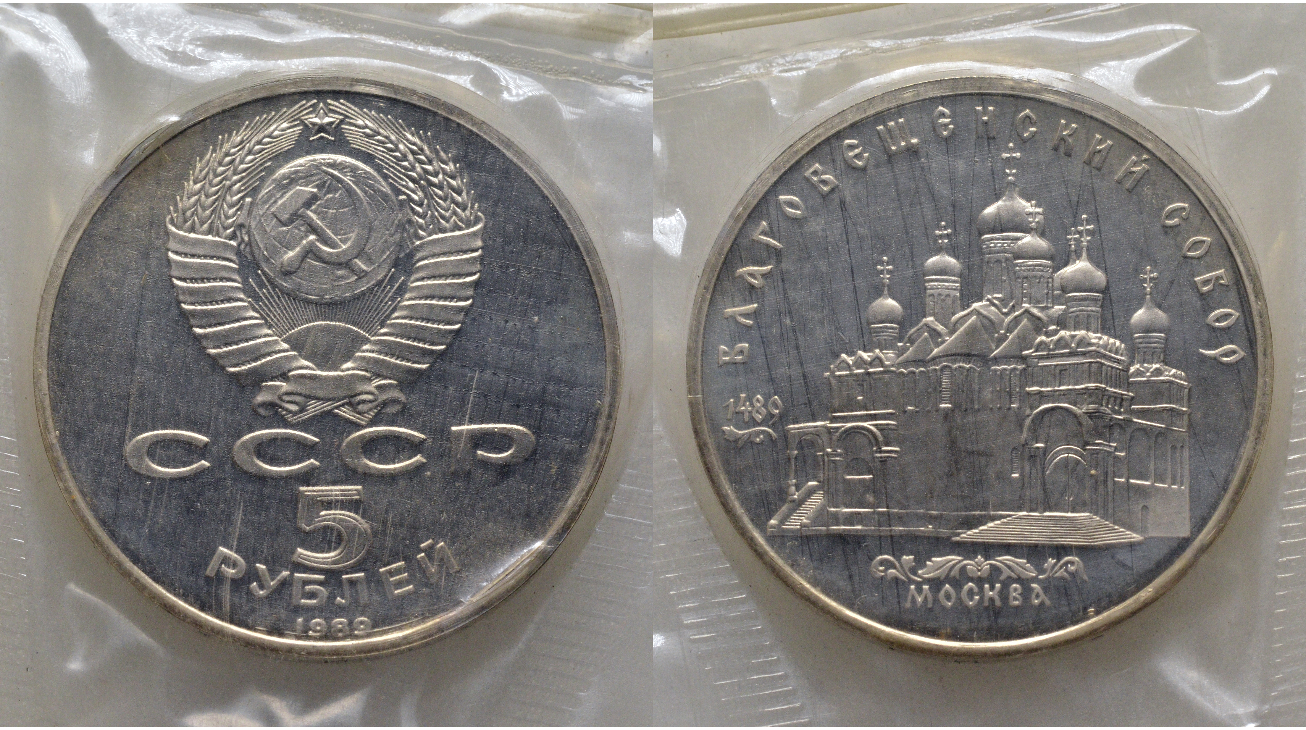 СССР 5 рублей 1989 БЛАГОВЕЩЕНСКИЙ СОБОР, ГОРОД МОСКВА, в запайке KM 230 медь никель цинк PROOF AUC1-4-13