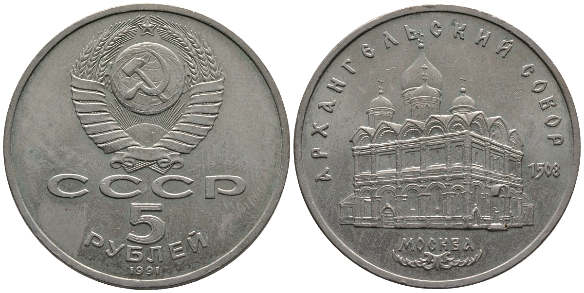 СССР 5 рублей 1991 Москва, Архангельский собор 1508 год KM 271 медно-никель 89-1221