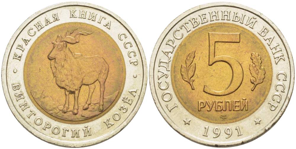 СССР 5 РУБЛЕЙ 1991 ЛМД, КРАСНАЯ КНИГА, ВИНТОРОГИЙ КОЗЁЛ KМ 281 биметалл UNC 4525-654