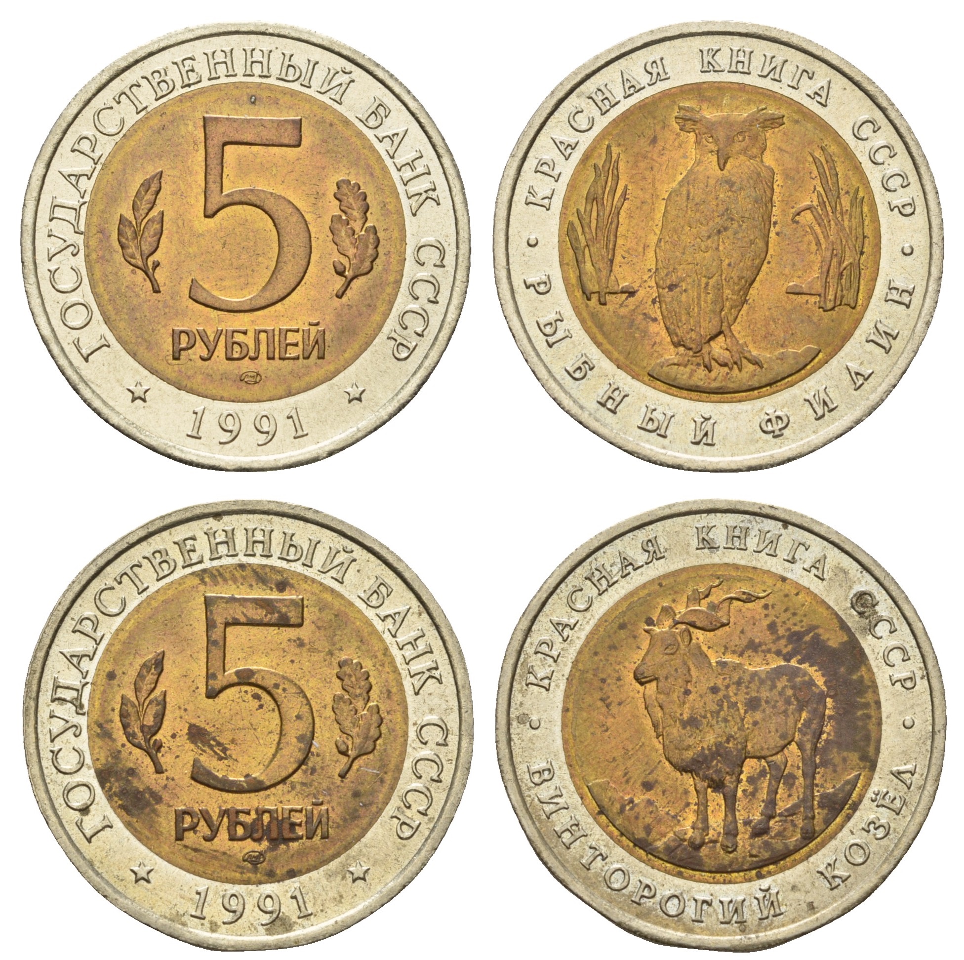 СССР лот из 2 монет по 5 рублей 1991 серия Красная книга, рыбный филин, винторогий козел KM 280, 281 биметалл UNC 4681-236-237