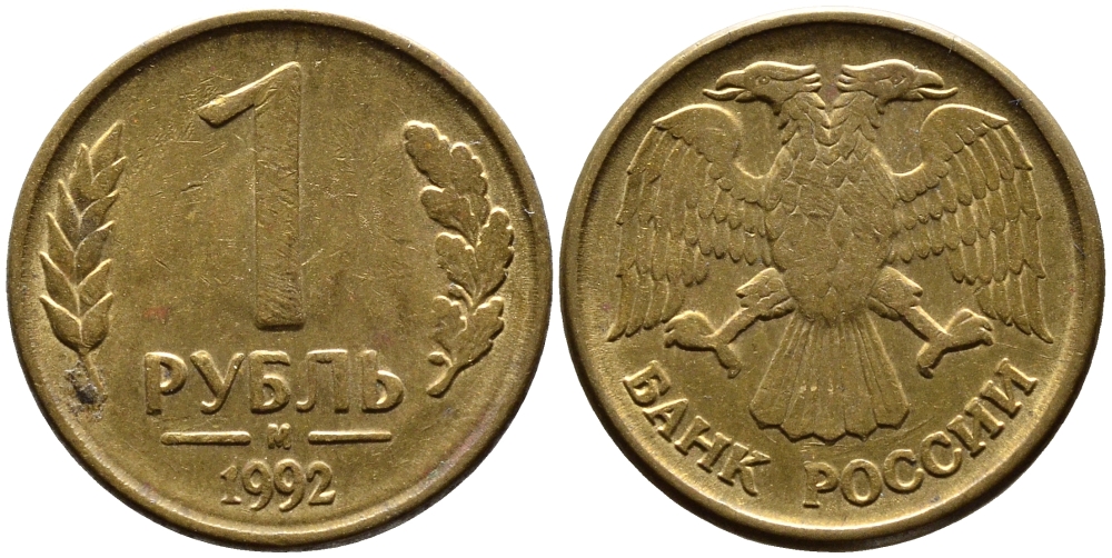 РОССИЯ 1 РУБЛЬ 1992 БУКВА М KM 311, Федорин 3 сталь плакированная латунью 4392-219