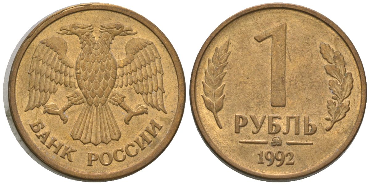 Россия 1 рубль 1992 монограмма ММД KM 311 сталь плакированная латунью 4585-827