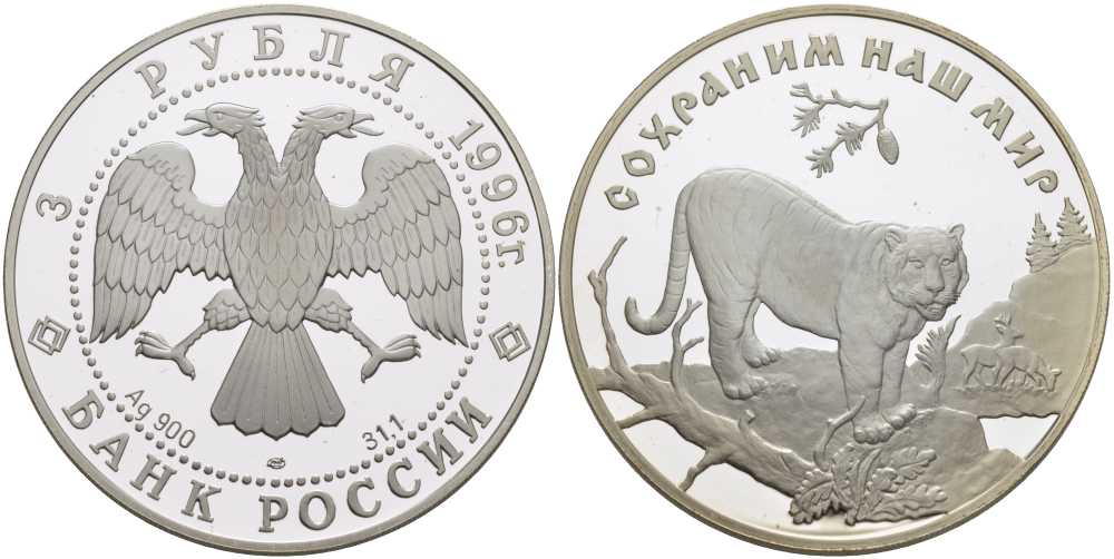 Россия 3 рубля 1996 ЛМД, серия сохраним наш мир, амурский тигр KM 535 серебро PROOF 1082-2-43