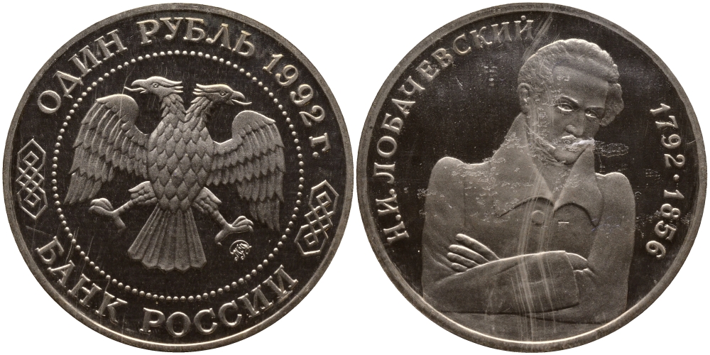 РОССИЯ 1 РУБЛЬ 1992 ЛОБАЧЕВСКИЙ Н.И. (1792-1856) KM 321 медно-никель PROOF 1515-231