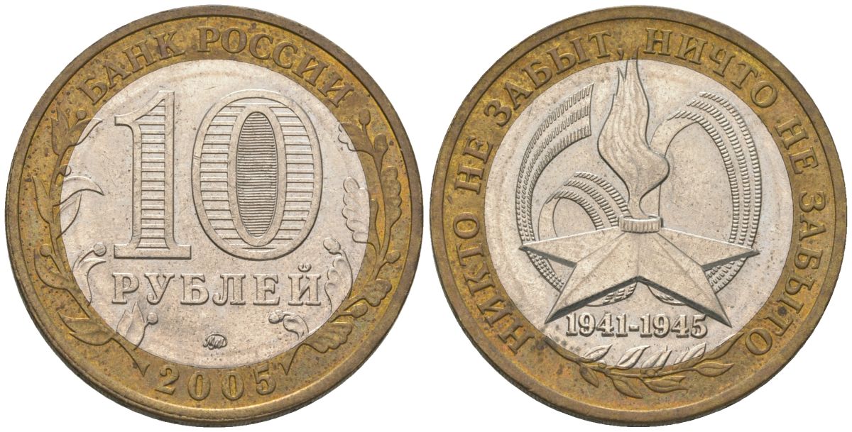 Россия 10 рублей 2005 ММД, 60 лет Победе в Великой Отечественной войне 1941-1945 гг KM 827 биметалл 4604-813