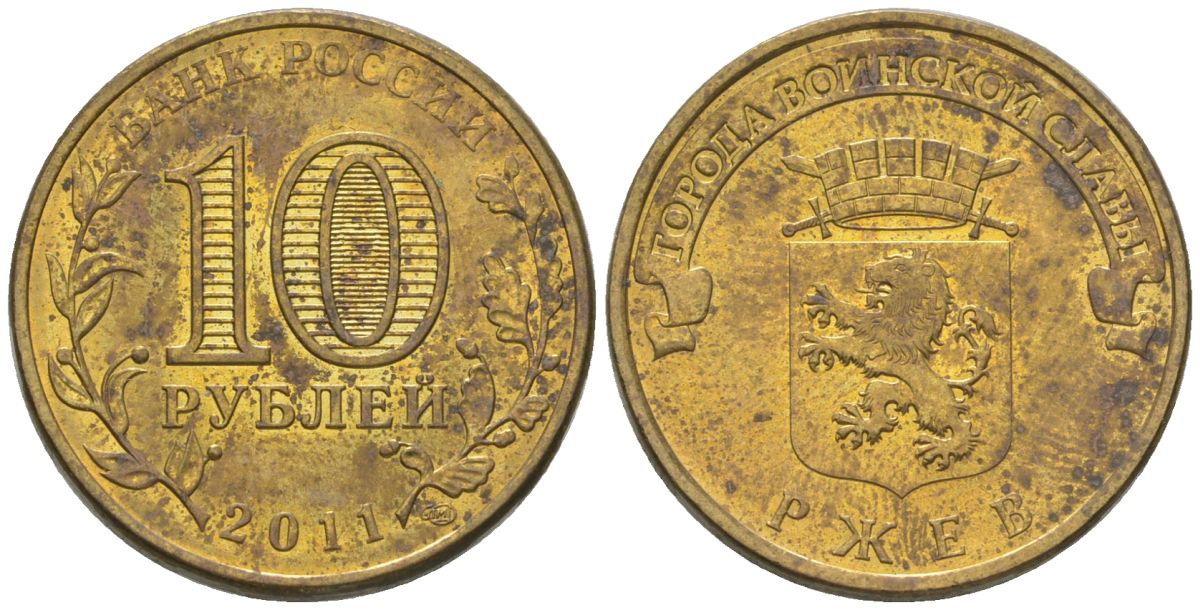Россия 10 рублей 2011 СПМД, Города воинской славы - Ржев KM 1323 сталь плакированная латунью 4604-936