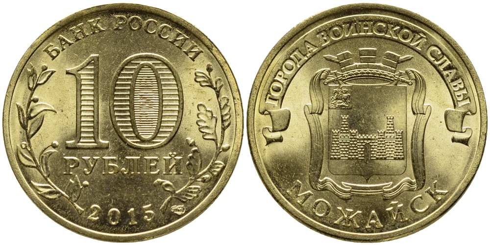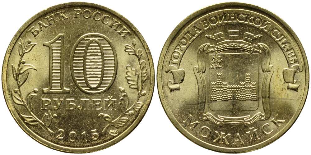 РОССИЯ 10 РУБЛЕЙ 2015 МОЖАЙСК, СПМД, СЕРИЯ ГОРОДА ВОИНСКОЙ СЛАВЫ, ГВС KM NEW сталь плакированная латунью UNC 216-332
