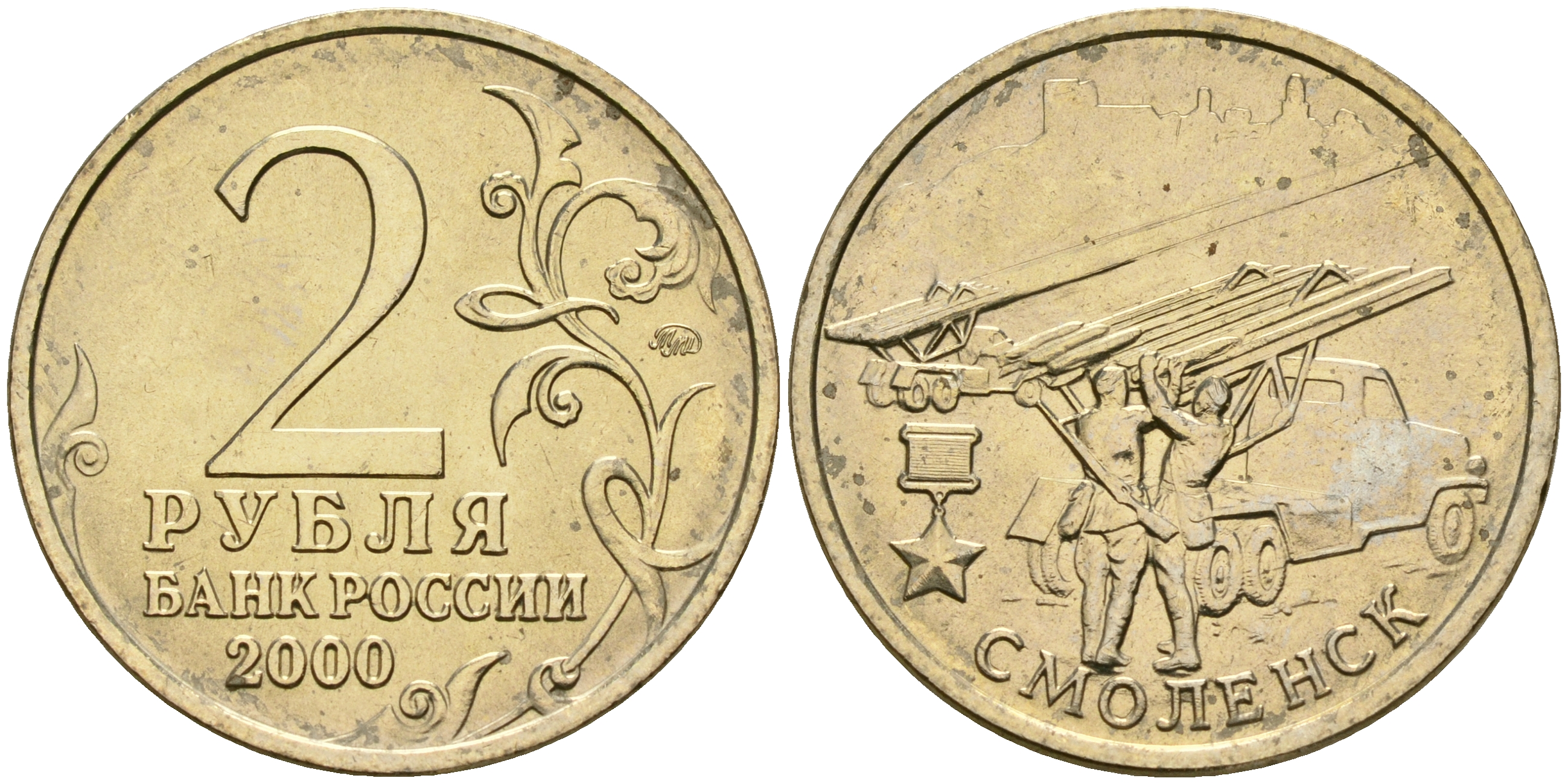 Россия 2 рубля 2000 ММД, 55 лет великой победе, город герой - Смоленск KM 665 медь никель цинк aUNC 4135-111