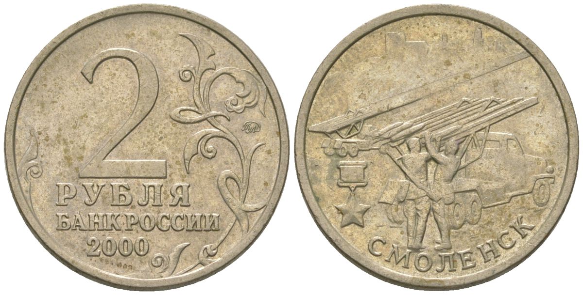 Россия 2 рубля 2000 ММД, Смоленск, 55 лет Победы KM 665 медно-никель 4605-1227