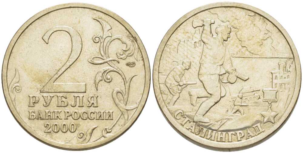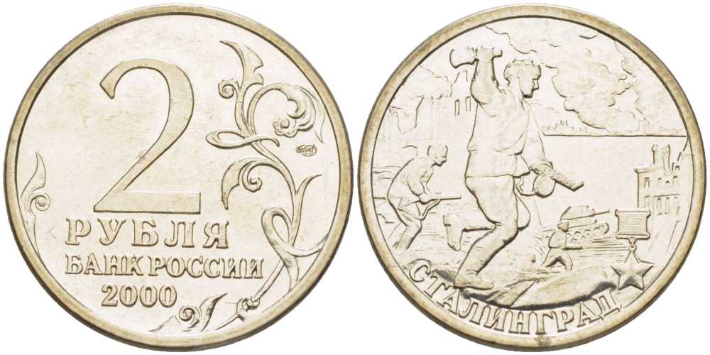 РОССИЯ 2 РУБЛЯ 2000 СЕРИЯ 55 ЛЕТ ВЕЛИКОЙ ПОБЕДЕ, ГОРОД-ГЕРОЙ СТАЛИНГРАД, СПМД KM 663 медь никель цинк 4390-1041