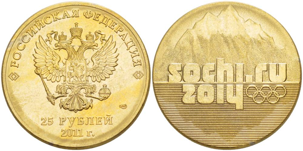 РОССИЯ 25 РУБЛЕЙ 2011 СПМД, ОЛИМПИЙСКИЕ ИГРЫ В СОЧИ 2014 ГОДА, ГОРЫ, ПОЗОЛОТА Y 1298 медно-никель UNC 4536-823