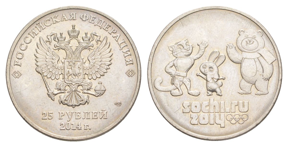 Россия 25 рублей 2014 XXII зимние Олимпийские Игры, Сочи 2014 - Талисманы Y 1368 медно-никель UNC 4629-921