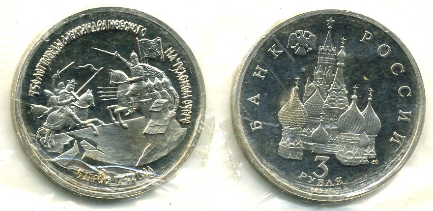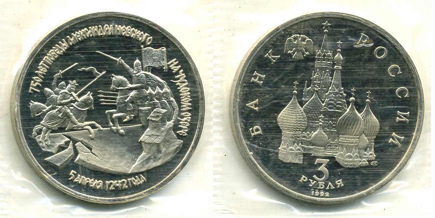 Россия 3 рубля 1992 750 лет Победы Александра Невского на Чудском озере, запайка KM 298 медно-никель PROOF M6-16