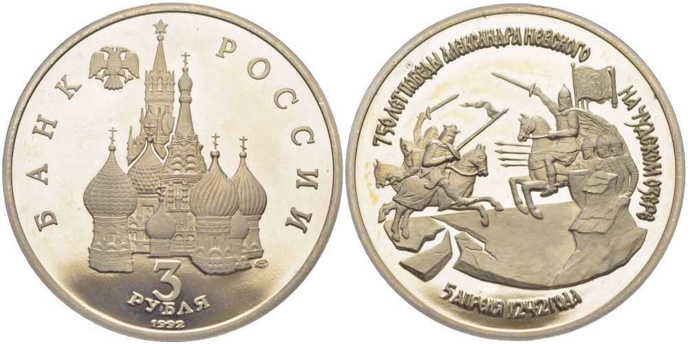 Россия 3 рубля 1992 750 лет Победы Александра Невского на Чудском озере KM 298 медно-никель PROOF 1081-2-63