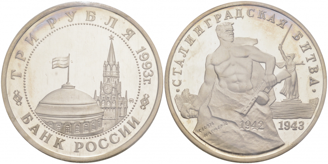 РОССИЯ 3 РУБЛЯ 1993 50-ЛЕТИЕ ПОБЕДЫ НА ВОЛГЕ, СТАЛИНГРАДСКАЯ БИТВА, В ЗАПАЙКЕ KM 318 медно-никель PROOF M30-17