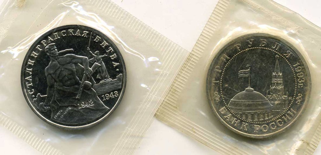 Россия 3 рубля 1993 ММД, 50 лет Победе на Волге, Сталинградская битва, в запайке Y 318 медно-никель PROOF M30-17